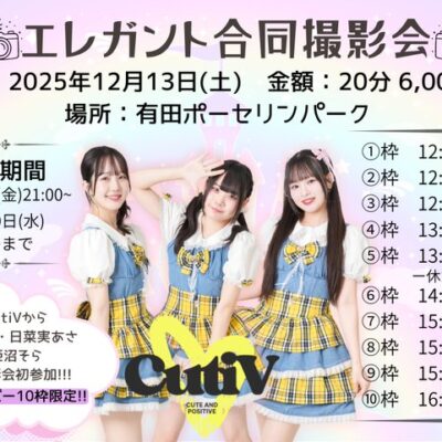 「CutiV(キューティブ)」は、「キュート」と「ポジティブ」を融合させた新しい魅力=“キューティブ”を体現するアイドルプロジェクトです。 名前には、可愛らしさと前向きなエネルギーを発信するアイドルを育てたいという想いが込められており、「Cuti」には“キュート”に加え、九州発祥を象徴する意味も含まれています。 エレガントプロモーション創業20周年を機にスタートした本プロジェクトでは、選抜されたメンバーが九州から全国へ、ポジティブなエネルギーを届けることを目指しています。